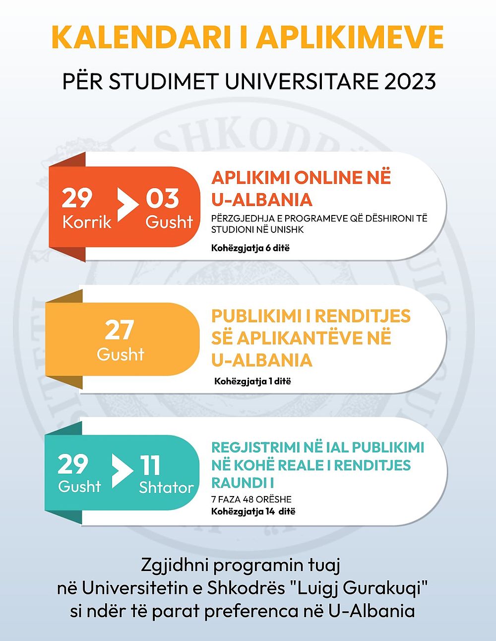Ju ftojmë të zgjidhni programet e studimit të Universitetit të Shkodrës "Luigj Gurakuqi" si ndër të parat preferenca tuajat në U-Albania.