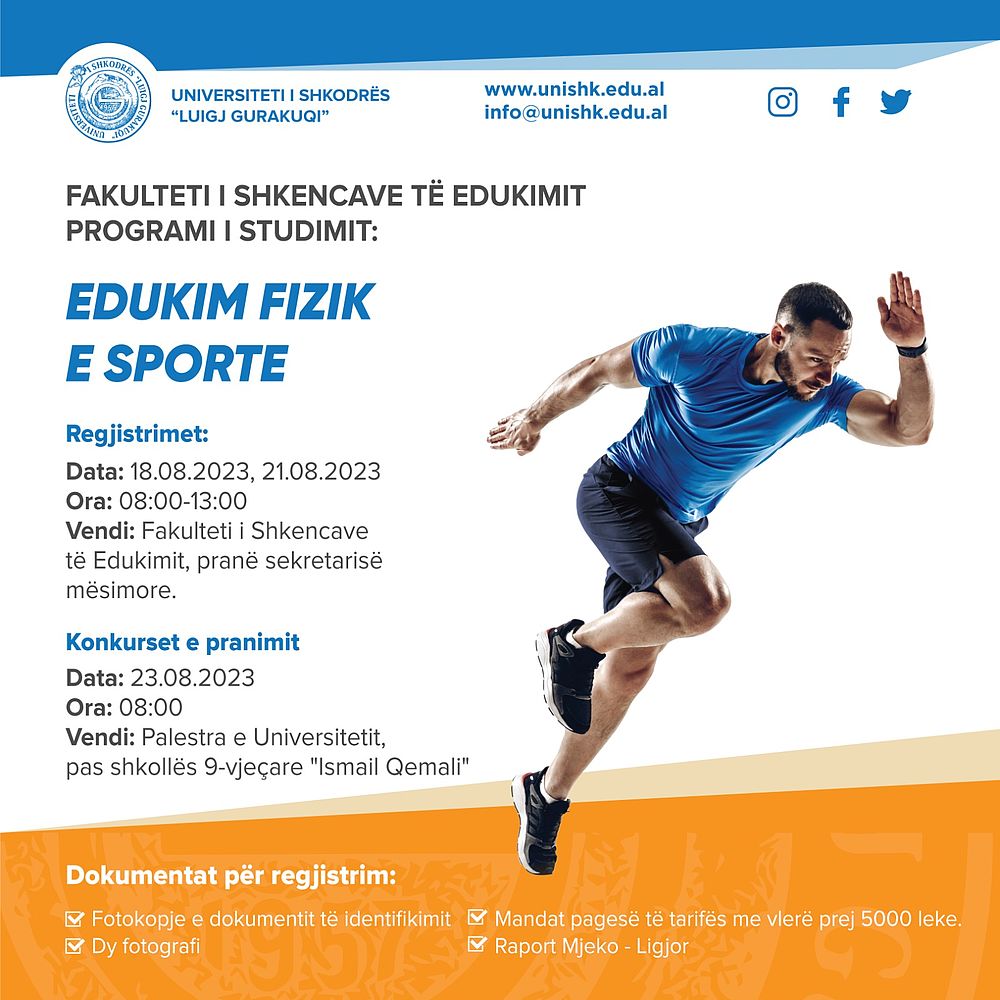Konkurset e pranimit në programin e studimit te ciklit të parë (Bachelor), viti akademik 2023 - 2024, në Edukim Fizik dhe Sporte, do të zhvillohet me datë 23.08.2023.